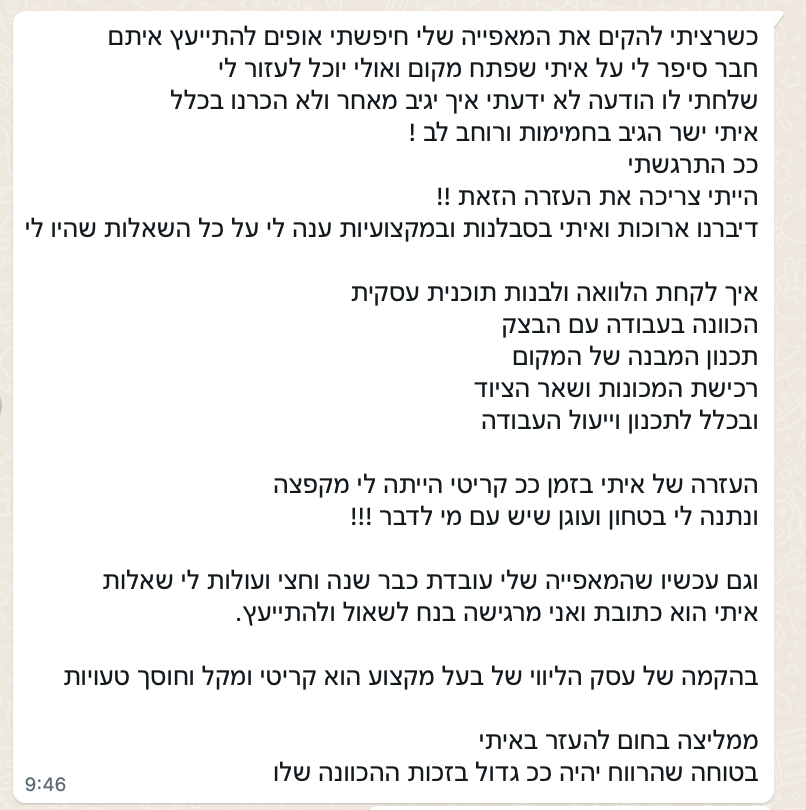 קבוצת המשתתפים האיכותית היא אחד הדברים הכי טובים שאיתם תצאו מהתכנית. בקבוצת הוואטסאפ תוכלו לקבל מענה שוטף ממני ולהתייעץ עם החברים המשתתפים בתכנית.